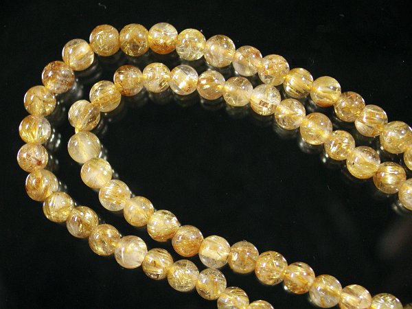 特価ゴールデンルチル(6) 3A5mm現品 仕上り寸法 約 φ4.9〜5.3(mm) 長さ 約 39.2cm 重量 約 15.43g 3Aとも5Aとも言える濃い目の色合いのタイチンを選んできましたので、照明で一段と輝きが増します。小粒ながらタイチンがかなりの量内包されているタイプです。1ミリのシリコンゴムが通ります。 撮影用の照明で輝きが増しております。照明を近づけるか自然光に当てて見た状態に近い画像で、ルチルが多いほど輝きが拡散されて透明部分まで金色掛かって見えています。 この商品は特価品の為、割引対象外商品となります。送料無料は適用されます。 |