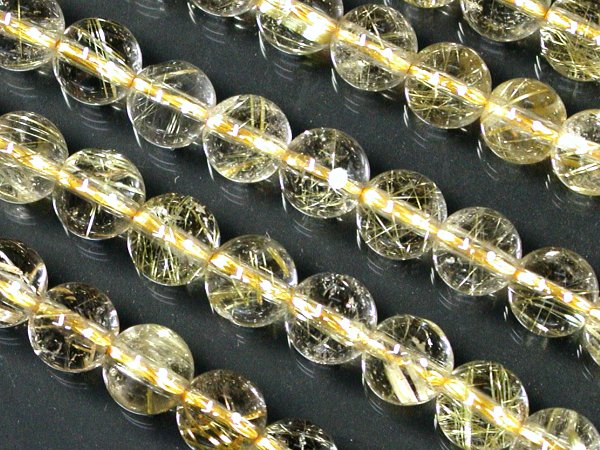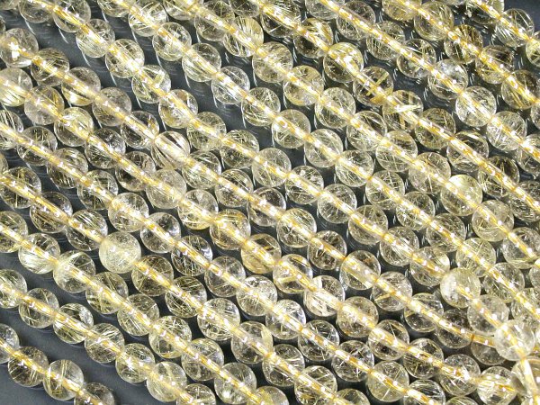 特価ゴールデンルチル(30) 2A8mm 仕上り寸法 約 φ7.8〜8.3(mm) 長さ 約 39〜39.5cm 重量 約 35g前後 面や雲の内包が少なく透明度のあるゴールデンルチル水晶ですが、少な目のルチルの内包されたものです。さりげなく金ルチルを入れたい時には効果のあるゴールデンルチルです。 7.9mm位の連も含まれますので、径の大きいものを含むものから出していきます。 撮影用の照明で輝きが増しております。照明を近づけるか自然光に当てて見た状態に近い画像で、ルチルが多いほど輝きが拡散されて透明部分まで金色掛かって見えています。 |