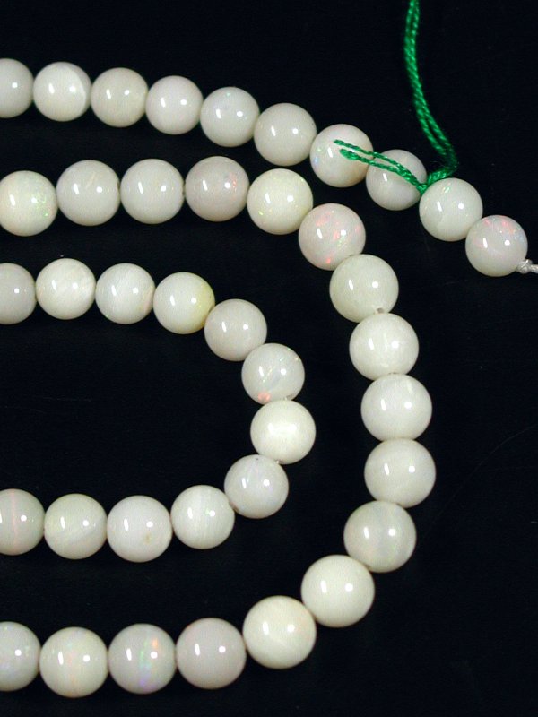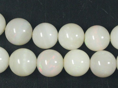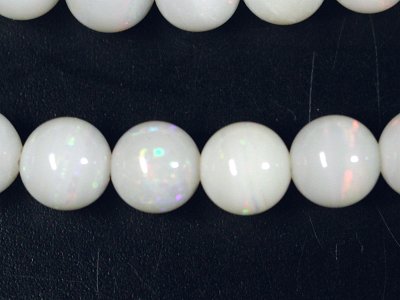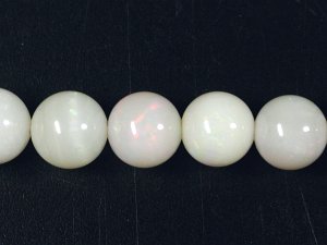 特販ホワイトオパール81.8ct(2) 仕上り寸法 約 5.6φ〜6.5(mm) 長さ 約 40.5cm オパールには遊色による美しい輝きが皆様を魅了し、特に人気のある宝石でもありますが、丸玉ビーズに加工されるのは極めて稀で、また遊色効果のあるものを丸玉にすることはほとんどありません。手間をかけて研磨して遊色が見られるかどうか分からないものを作るよりも、見えている物を取り出してアクセサリーなどにする方がはるかに楽で効率の良い事は誰しもが気付くはずです。 そうした数少ない中で求めてきたホワイトオパールですが、遊色は多くはありませんが見えています。この程度でもラウンドビーズとしては良い方になります。 |