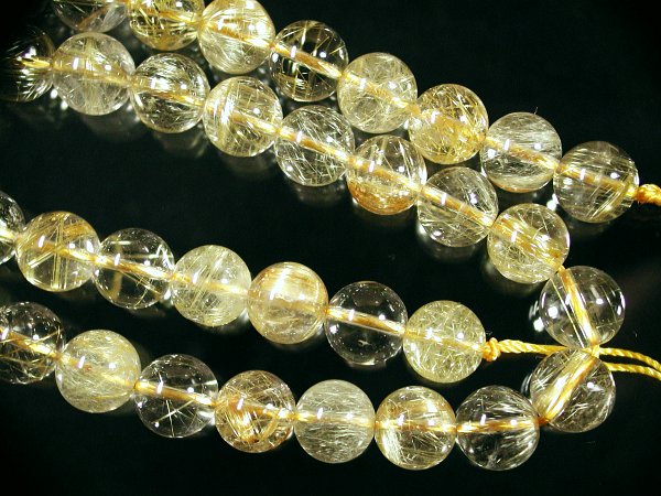 金ルチルの状態、量の異なるビーズで出来上がった連ですが、透明度の高い良質の原石を使用しておりますので、非常に綺麗です。画像では照明の反射なども影響して輝いておりますが、平面やヘマタイトの見えるものを含んでいるものも1,2個ありますので、その分割り引きをした価格にしております。予めご了承下さい。とにかく透明感があるために美しいです。